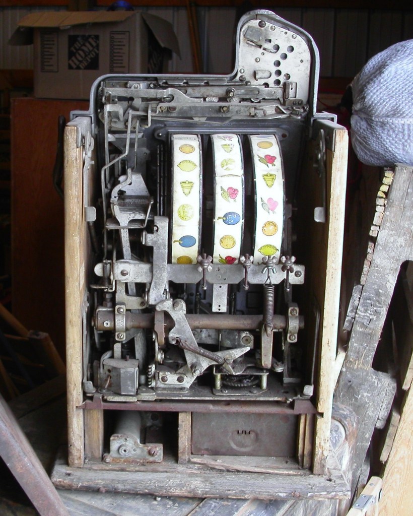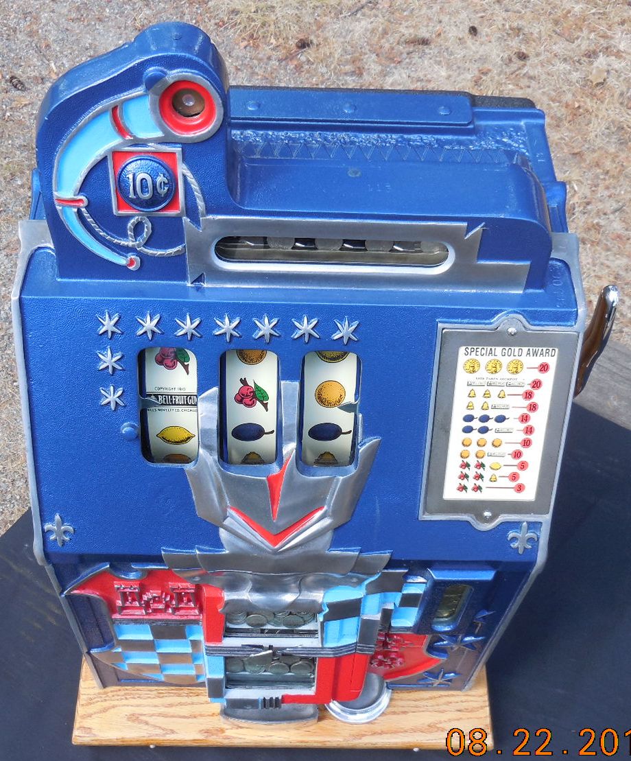 This is a very nice Mills $0.10 cent Castle Front slot machine in original condition . This machine has been completely restored. The paper components have been replaced. Paper means reel strips, tags on the inside and the label on the inside of the back cover. The cabinet base has also been replaced. Original back door and back bonnet and mills lock and key. No cracks or breaks anywhere on this machine. This is a honey of a Mills antique slot machine from the 30’s, so if you want a slot machine that is really nice, and runs great. Everything works like new, plays and pays just fine. Complete with working reserve jackpot and the Gold Award option. Just looking at this machine makes you want to own it, you can just hit the Add to Cart button and it is yours.