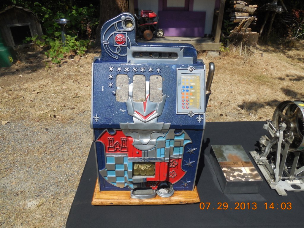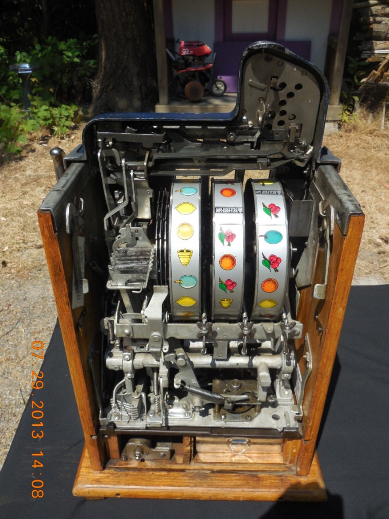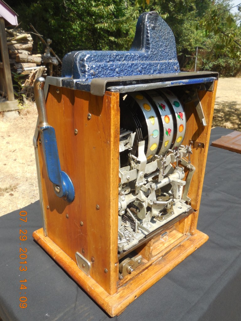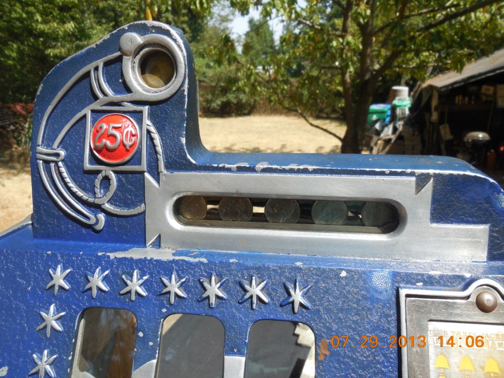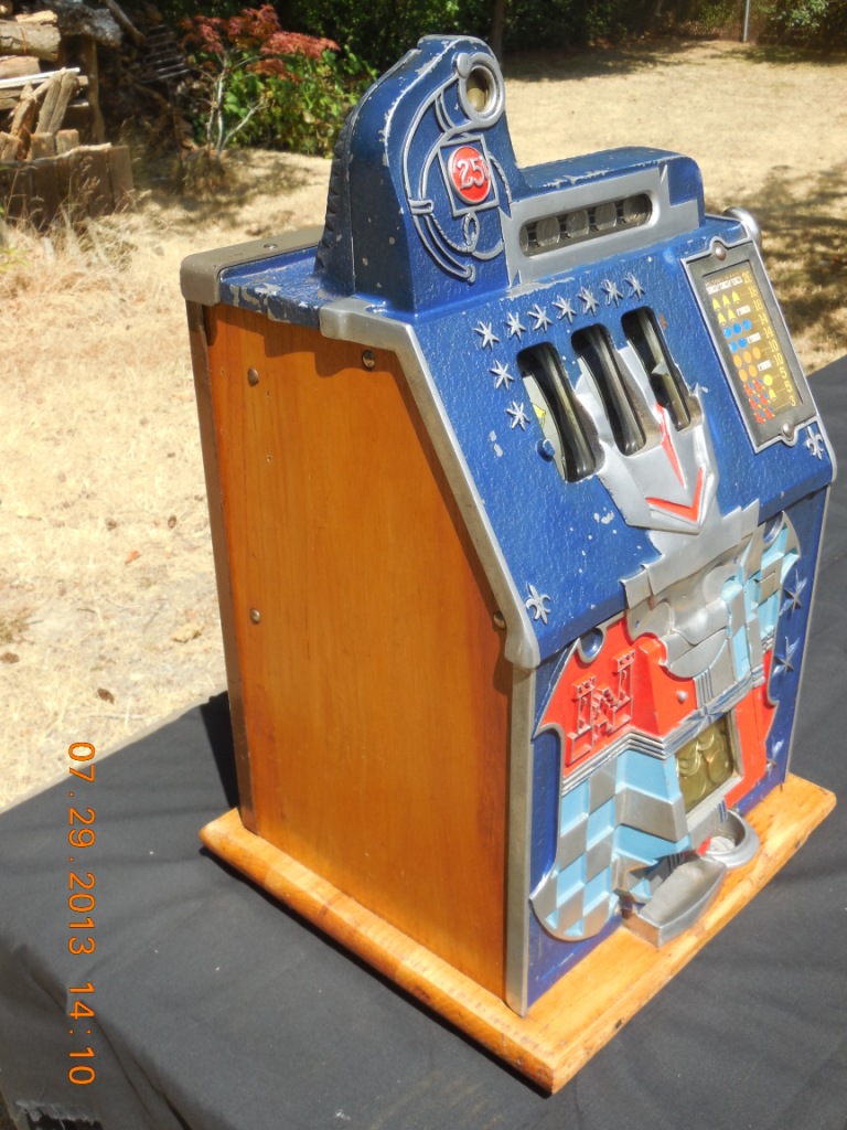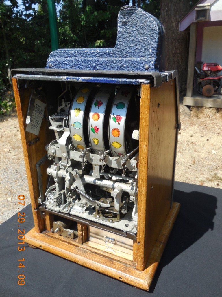 This is a very nice original condition .25 cent Mills Blue front, Castle front, and even called a mystery front slot machine. Everything works great, plays and pays just fine, recently lubricated, greased and oiled. The mechanism is in like new condition, just look at it! Original back door and back bonnet and mills lock and key. No cracks or breaks anywhere on this machine. This is a honey of a Mills antique slot machine from the 30’s, so if you want a slot machine that is really nice, and runs great, and a slot machine that has just been serviced so it operates smoothly and as it should, and a slot machine with no damage and in original antique condition, this is it!. Notice that it even has the coin holding assembly lever up on the right side of the coin escalator; you rarely see these “coin holding” devices still working on an old slot machines. It holds the second quarter at the top of the coin escalator until the machine has finished playing the first quarter and then drops the second quarter automatically into play. The Jackpot also has the reserve portion assembly that will reload the jackpot on the next play, after a jackpot win and payout. This is it! So hit the add to cart button. Shipping will be by Fed-x and insured, and at a flat rate which includes packing, insurance, Original back door and back bonnet and mills lock and key. No cracks or breaks anywhere on this machine.delivery and drop off to your door anywhere in the lower 48 states in the U.S.A. and the flat fee for all this is 169.00. I may ship overseas but you will have to contact me first before buying so we can discuss the costs. Thank You for looking at my auction and at this very fine slot machine.