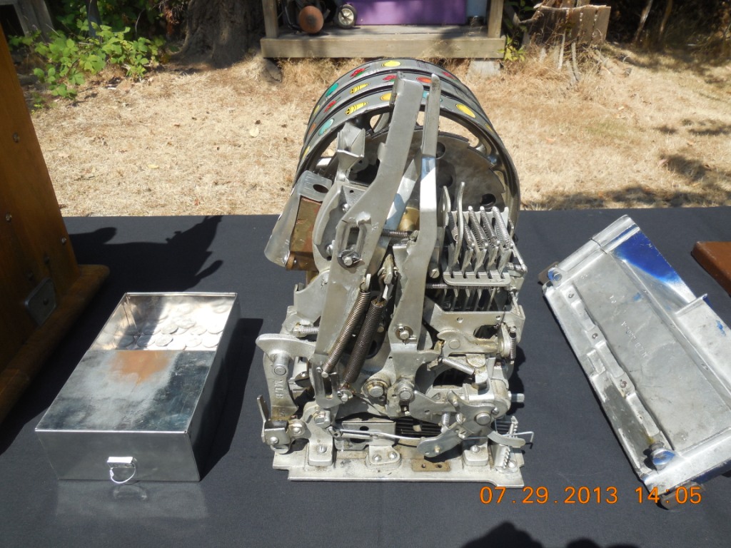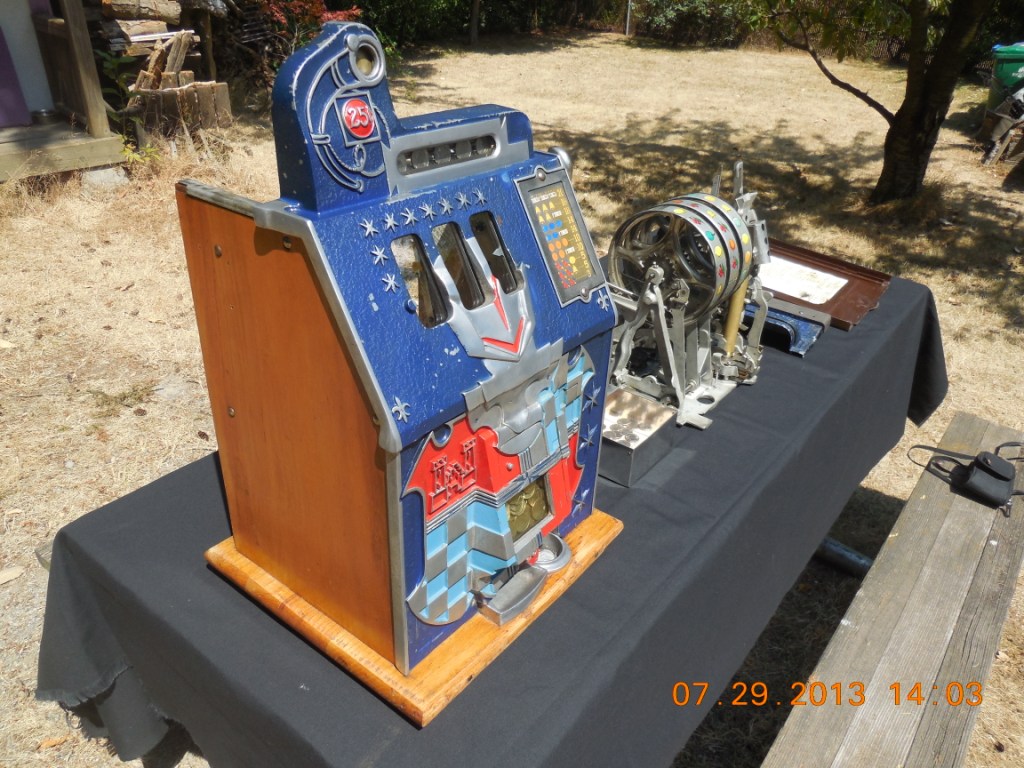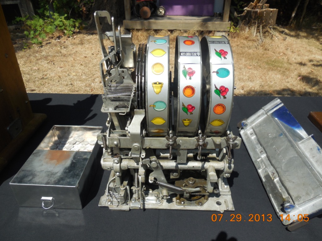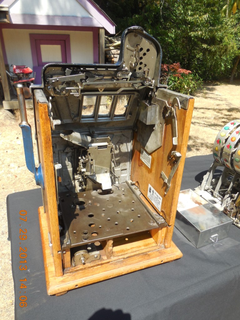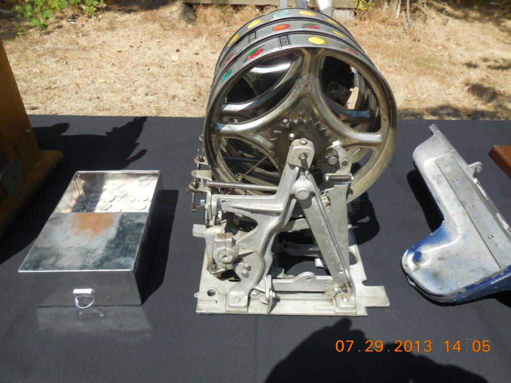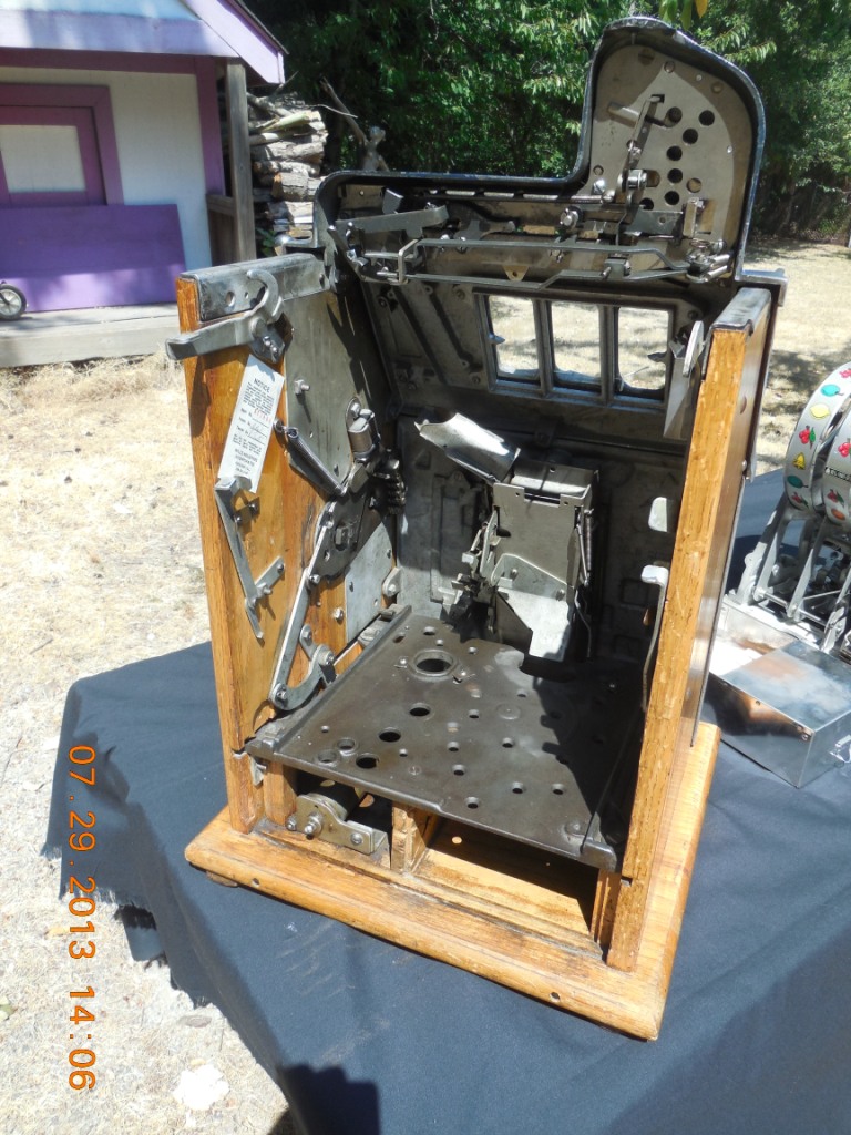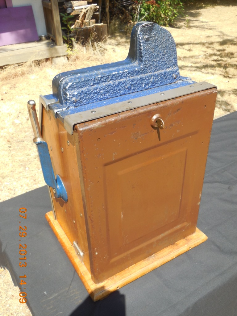 This is a very nice original condition .25 cent Mills Blue front, Castle front, and even called a mystery front slot machine. Everything works great, plays and pays just fine, recently lubricated, greased and oiled. The mechanism is in like new condition, just look at it! Original back door and back bonnet and mills lock and key. No cracks or breaks anywhere on this machine. This is a honey of a Mills antique slot machine from the 30’s, so if you want a slot machine that is really nice, and runs great, and a slot machine that has just been serviced so it operates smoothly and as it should, and a slot machine with no damage and in original antique condition, this is it!. Notice that it even has the coin holding assembly lever up on the right side of the coin escalator; you rarely see these “coin holding” devices still working on an old slot machines. It holds the second quarter at the top of the coin escalator until the machine has finished playing the first quarter and then drops the second quarter automatically into play. The Jackpot also has the reserve portion assembly that will reload the jackpot on the next play, after a jackpot win and payout. This is it! So hit the add to cart button. Shipping will be by Fed-x and insured, and at a flat rate which includes packing, insurance, Original back door and back bonnet and mills lock and key. No cracks or breaks anywhere on this machine.delivery and drop off to your door anywhere in the lower 48 states in the U.S.A. and the flat fee for all this is 169.00. I may ship overseas but you will have to contact me first before buying so we can discuss the costs. Thank You for looking at my auction and at this very fine slot machine.